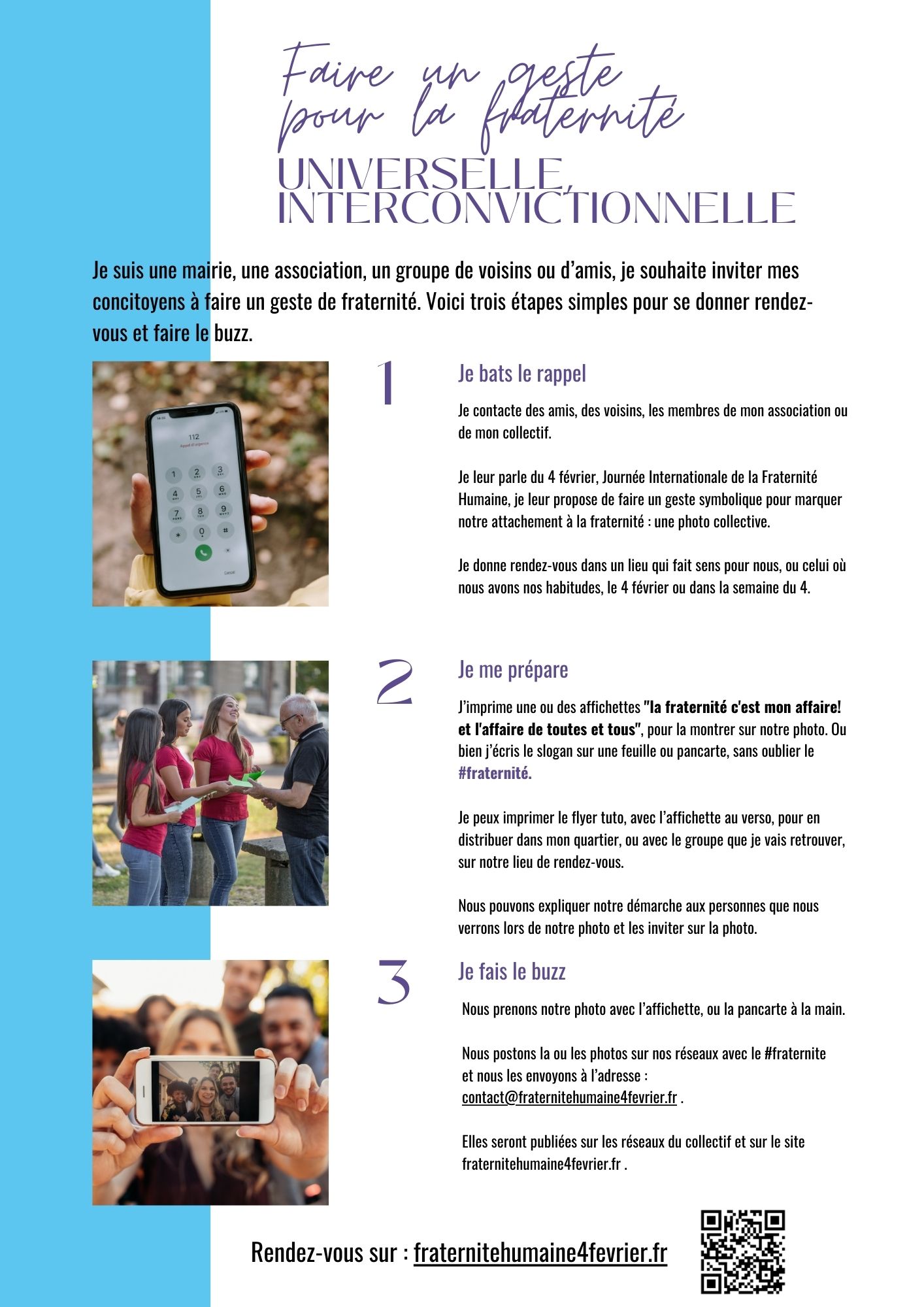 Ensemble, nous lançons un appel à la mobilisation. Pour que cette journée du 4 février marque les esprits et porte ses fruits, nous avons besoin les uns des autres. Nous avons besoin de vous ! Pour que la fraternité soit vraiment l’affaire de toutes et tous !