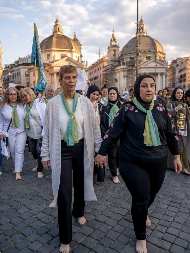 Rejointes ce jour là par des femmes d’autres nations, d’ONGs partenaires et de marcheuses anonymes venues de 36 pays, elles ont choisi le SILENCE et la marche PIEDS NUS dans les rues de Rome pour faire entendre leur appel. La marche a débuté à 16h à l’arche de la paix, pour finir place des Peuples. Pax Christi a marché pieds nus aux côtés de ces femmes et a pu les rencontrer et interviewer les principales organisatrices :